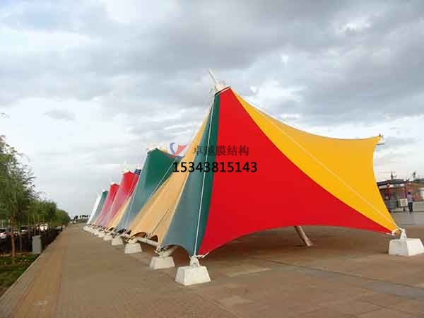 索膜結構景觀棚建造要點:其建造要點主要有材料的選擇、色彩與造型搭配、施工安裝。在材料的選擇方面,膜材的性能直接影響景觀棚的質量和使用壽命,應選擇具有高強度、耐候性好、透光性適宜、自潔性強等特點的膜材,如PVDF膜材、PTFE膜材等。同時,對于支撐索、鋼桿、連接件等也需要選擇質量可靠、耐腐蝕的材料。在色彩與造型搭配中,需結合周圍環境和使用需求,選擇合適的膜材顏色和景觀棚造型,使其與周圍環境相協調,形成統一的景觀效果。顏色可以選擇鮮艷明亮的色彩,以突出景觀棚的標志性和吸引力,也可以選擇與自然環境相近的色彩,以達到融合自然的效果。在施工安裝過程中需要嚴格按照設計要求和施工規范進行操作,確保基礎工程的牢固性、支撐結構的安裝精度、膜材的張拉力度和安裝平整度等。同時,要注意施工安全,做好現場的安全防護措施。