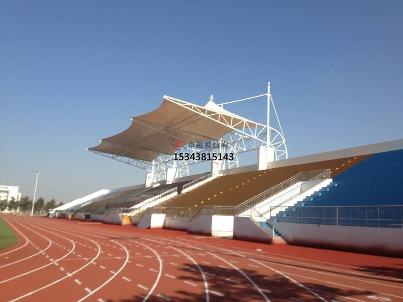 操場(chǎng)索膜結(jié)構(gòu)體育看臺(tái)的功能優(yōu)勢(shì):其在功能性方面,主要有遮陽(yáng)避雨、通風(fēng)與采光、聲學(xué)效果等優(yōu)勢(shì)。操場(chǎng)索膜結(jié)構(gòu)體育看臺(tái)可以為觀眾提供良好的遮陽(yáng)和避雨功能,無(wú)論晴天還是雨天,都能讓觀眾舒適地觀看比賽或活動(dòng),保護(hù)觀眾免受陽(yáng)光直射和雨水侵襲。索膜結(jié)構(gòu)的開放性有利于自然通風(fēng),使看臺(tái)內(nèi)空氣流通順暢,減少悶熱感;同時(shí),膜材的透光性可使看臺(tái)在白天獲得充足的自然采光,節(jié)約照明能源,降低運(yùn)營(yíng)成本。通過(guò)合理的設(shè)計(jì)和材料選擇,可以在一定程度上改善看臺(tái)的聲學(xué)效果,減少回音和噪音干擾,為觀眾和運(yùn)動(dòng)員提供更清晰的聲音環(huán)境。
