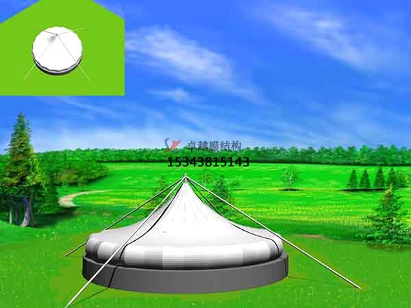 索膜結構反吊膜形式介紹:常見的索膜結構反吊膜主要有鋼支撐和懸索反吊兩種形式。其中鋼支撐反吊膜的原理是指池體上面以鋼結構為支撐,膜材反吊在鋼結構下部,可防止鋼結構被腐蝕,充分發揮鋼材的結構性能和膜材的抗腐蝕性能,延長結構的使用年限。懸索反吊膜是利用單層膜材將污水池直接封閉,膜材通過鋼構連接件錨固在周邊池壁或鋼結構上,再利用懸索、懸桿可調壓力將膜面中心壓低,呈漏斗狀,懸桿底部留排水孔,利用法蘭與主體膜連接,形成穩定的受力結構。