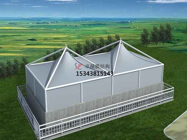 索膜結構反吊膜結構構成:索膜結構反吊膜采用了反吊設計,利用索膜協同作用,用膜材、索系統和支撐結構構成。其反吊設計采用鋼結構在外、膜材在內的倒置形式,高強度膜材(如氟碳纖維膜)覆蓋污水池表面,鋼結構懸吊于膜材外側。這種設計使鋼構避免直接接觸池內腐蝕性氣體,顯著延長使用壽命。索膜協同作用利用膜材作為覆蓋主體,需施加預張力形成穩定的負高斯曲面,通過形狀變化分散荷載,還有索系統,包括脊索、谷索等,傳遞膜內力至支承結構,增強穩定性并減少膜材自由支承長度(通常≤15米)。支撐形式主要是鋼支撐、懸索和充氣式,鋼支撐式適用性強,可設計為固定式或隨動式,兼顧密封與設備維護需求;懸索式無骨架支撐,依靠柔性拉索調節膜面壓力,性價比高但適用場景有限;充氣式(無骨架)是以空氣支撐膜面,適合超大跨度池體(如直徑>30米),便于開設檢修門窗。