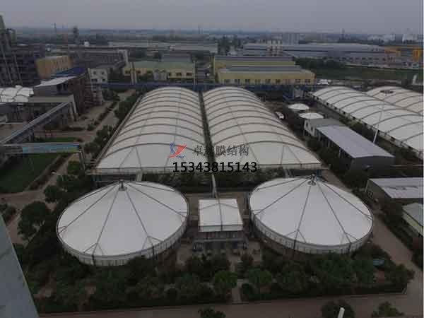 索膜結構反吊膜應用廣泛,常見于市政污水廠、化工廠、制藥廠、印染廠等領域的敞開式污水池密封,兼顧廢氣收集、景觀美化(曲面造型)及空間再利用(如池頂平臺)。代表性案例如上海白龍港污水廠、齊魯石化污水處理項目等。