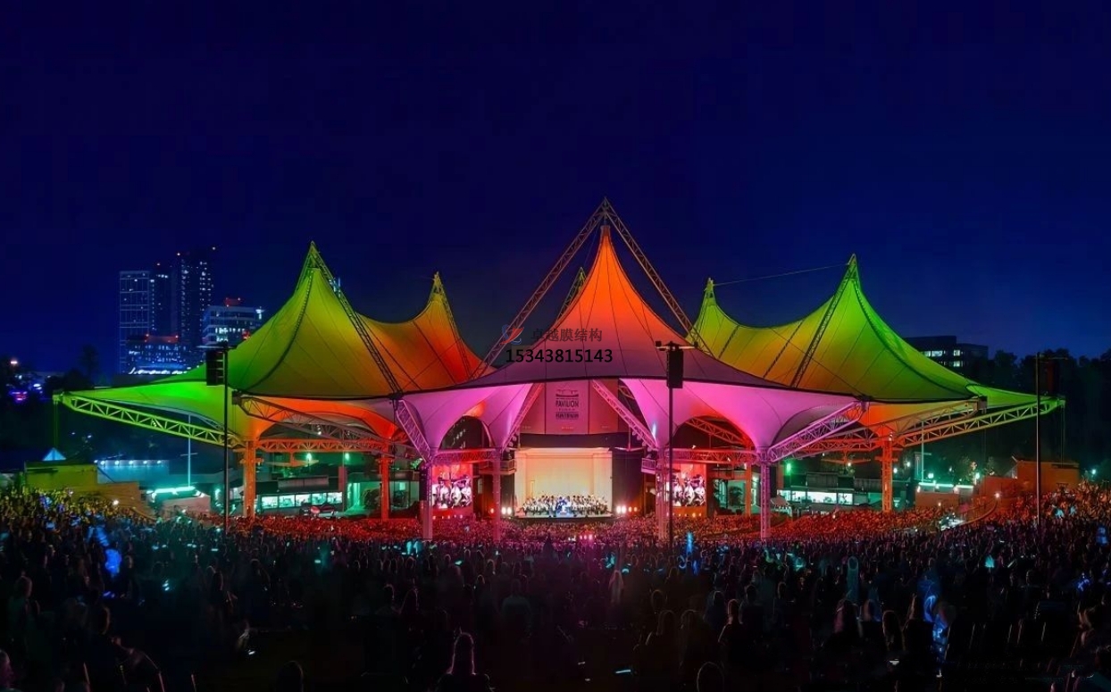 膜結(jié)構(gòu)景觀的膜材料可以透光或反射光線,創(chuàng)造出豐富的光影效果,使得建筑物在不同的時(shí)間和角度呈現(xiàn)出不同的視覺(jué)效果。膜結(jié)構(gòu)景觀常用的膜材料是PTFE膜材料和PVC膜材料。膜結(jié)構(gòu)景觀棚具有優(yōu)異的抗拉強(qiáng)度和耐候性能,能夠承受風(fēng)力和其他天氣因素的沖擊。